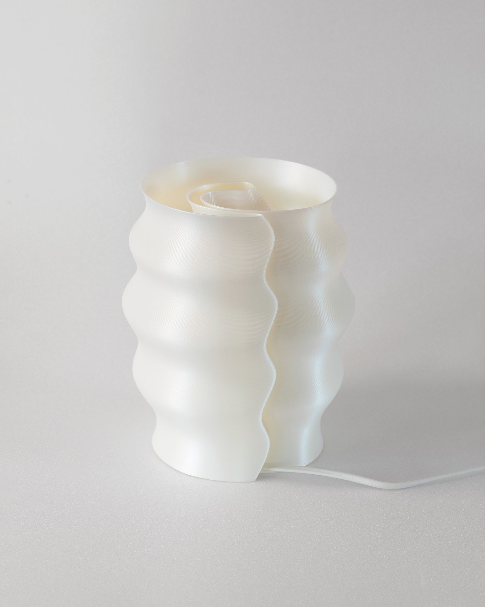 This table lamp is printed in a single, continuously piece, which is hiding and holding the light bulb at the same time in order to produce a soft and indirect light. Its organic and rounded shape increases its stabilty and is inspired by creatures of the sea.